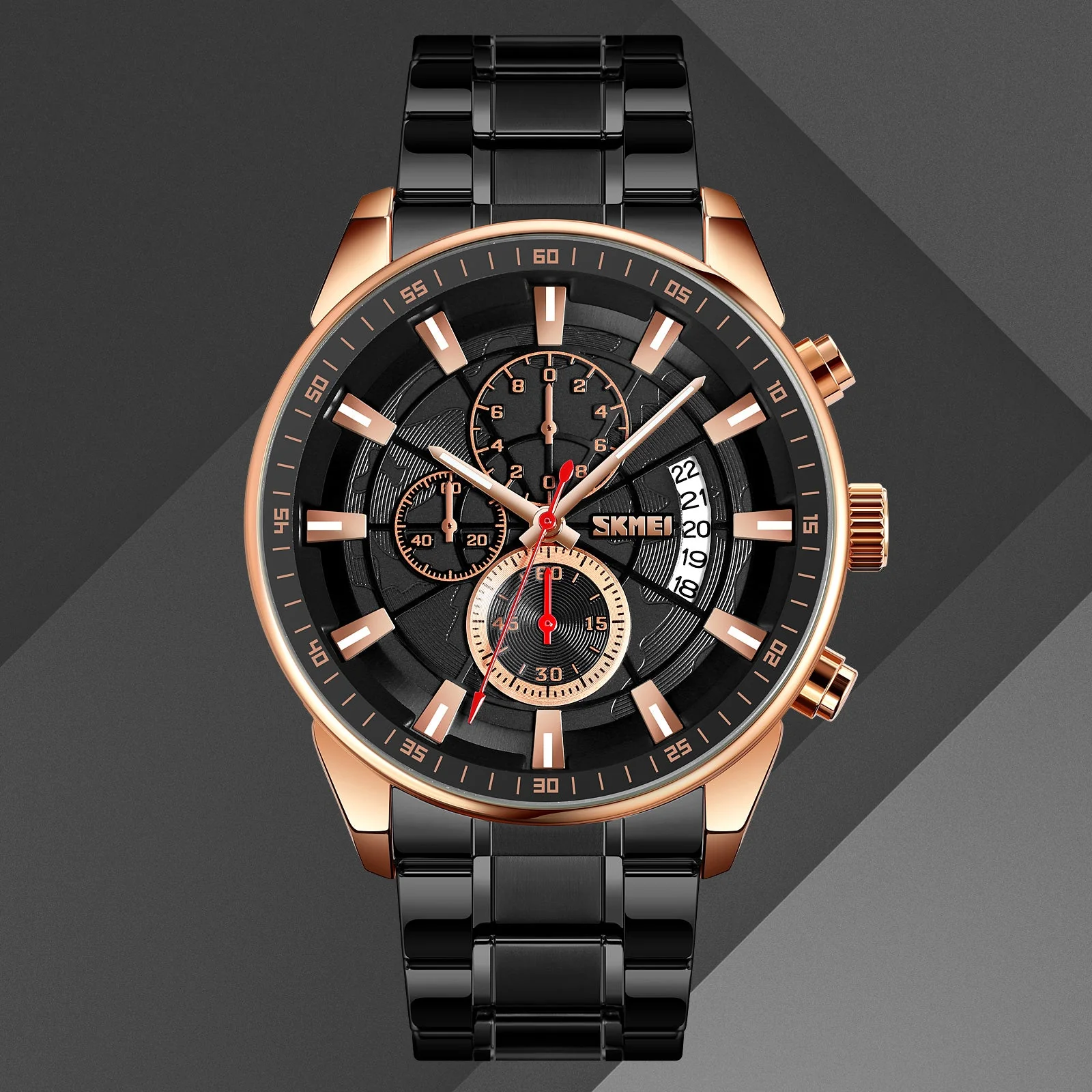 This stylish and functional quartz chronograph watch by SKMEI features a dual-shade design and 30M water resistance, making it durable for daily wear. It includes a chronograph function, date display, 47mm zinc alloy case, and stainless-steel buckle, blending perfectly with any occasion.